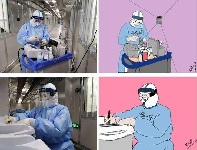 這些畫(huà)都出自吉林支援武漢醫(yī)療隊(duì)護(hù)士李藝璇,來(lái)自長(zhǎng)春中醫(yī)藥大學(xué)附屬醫(yī)院腦病中心。她從書(shū)上了解到,看漫畫(huà)能夠緩解人的心理壓力,就發(fā)揮特長(zhǎng),在病區(qū)的墻上手繪了一些鼓舞人心的漫畫(huà)和文字,沒(méi)想到真發(fā)揮了作用,其他醫(yī)療隊(duì)隊(duì)員看到后深受鼓舞,也在其他病區(qū)的墻上寫(xiě)上了詩(shī)詞、畫(huà)上了漫畫(huà)。不僅如此,她還用畫(huà)筆記錄下了戰(zhàn)友們的日常工作。