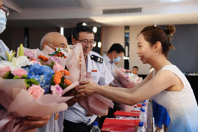 為“光榮在黨五十年”紀念獎?wù)芦@得者獻花