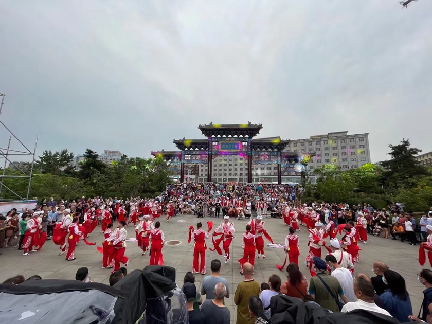 當(dāng)晚18:00,隨著氣勢磅礴的鼓聲和激昂的音樂,來自陜西“腰鼓之鄉(xiāng)”的安塞祥云文化傳媒有限公司震撼上演國家級非物質(zhì)文化遺產(chǎn)項(xiàng)目安塞腰鼓。鼓槌揮舞,紅綢翻飛,縱情跳躍,酣暢淋漓,陜北人民的淳樸與豪放展現(xiàn)的淋漓盡致,有著2000多年歷史的安塞腰鼓激蕩人心,正如當(dāng)代詩人、散文家劉成章在《安塞腰鼓》一文中所描述的:“容不得束縛,容不得羈絆,容不得閉塞。是掙脫了、沖破了、撞開了的那么一股勁!好一個安塞腰鼓!”大批觀眾駐足觀看,點(diǎn)燃了全場的熱情。