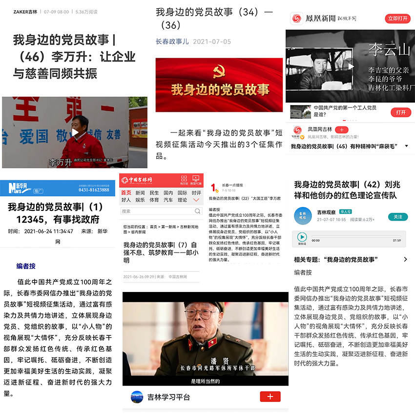 百部優(yōu)秀短視頻于6月24日開始在全網(wǎng)全平臺展播,每天推出三個優(yōu)秀作品。人民網(wǎng)、新華網(wǎng)、鳳凰網(wǎng)、學(xué)習(xí)強國、華人頭條、一點資訊、中國吉林網(wǎng)、ZAKER吉林和長春本地網(wǎng)絡(luò)媒體紛紛建專題同推廣,全市LED大屏同步播放,為慶祝建黨百年營造濃厚氛圍。截至7月8日,僅人民網(wǎng)專題閱讀量就達到530余萬次。白山松水之間、勞動生產(chǎn)一線、平凡崗位之中,廣大黨員、黨組織用專業(yè)和行動助力長春經(jīng)濟發(fā)展、投身長春建設(shè);用愛心和奉獻關(guān)心群眾生活;用熱血和赤誠書寫奮斗故事,讓黨的精神閃耀傳承。