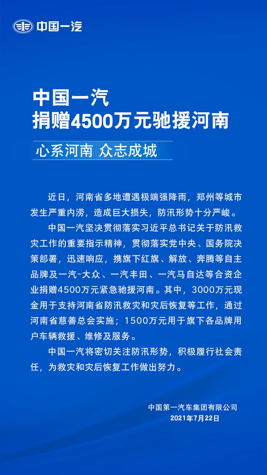 心系河南 眾志成城 中國(guó)一汽捐贈(zèng)4500萬(wàn)元馳援河南