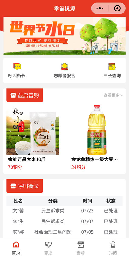 “群眾還可以在‘幸福桃源’小程序還呼叫街長,查詢單元長、樓棟長、網(wǎng)格長,發(fā)布心愿和問題。志愿者看到心愿并認領后可獲得相應積分,積分可以兌換生活用品;問題接單后將進行分類處理,確保24小時內(nèi)給群眾反饋。”趙南介紹,“幸福桃源小程序”上動動手指、拍段視頻,就能解決居民身邊的問題,黨群關系也逐漸“升溫”。