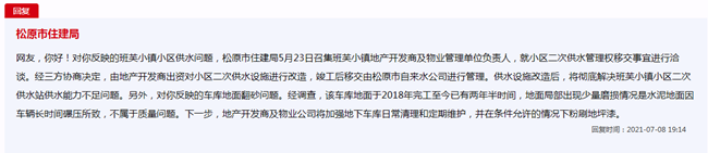 民之所盼,政之所向。收到留言后,松原市督考辦督查保障一科、輿情督查保障科負責人王權立即與自來水公司、住建局進行溝通,核實情況。松原市住建局回復稱:“網友,你好!對你反映的班芙小鎮小區供水問題,松原市住建局5月23日召集班芙小鎮地產開發商及物業管理單位負責人,就小區二次供水管理權移交事宜進行洽談。經三方協商決定,由地產開發商出資對小區二次供水設施進行改造,竣工后移交由松原市自來水公司進行管理。供水設施改造后,將徹底解決班芙小鎮小區二次供水站供水能力不足問題。另外,對你反映的車庫地面翻砂問題。經調查,該車庫地面于2018年完工至今已有兩年半時間,地面局部出現少量磨損情況是水泥地面因車輛長時間碾壓所致,不屬于質量問題。下一步,地產開發商及物業公司將加強地下車庫日常清理和定期維護,并在條件允許的情況下粉刷地坪漆。”