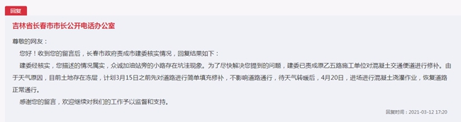 收到留言后,長春市政府責成市建委核實情況并回復: “經核實,您描述的情況屬實,眾誠加油站旁的小路存在坑洼現象。為了盡快解決您提到的問題,建委已責成原乙五路施工單位對混凝土交通便道進行修補。由于天氣原因,目前土地存在凍層,計劃3月15日之前先對道路進行簡單填充修補,不影響道路通行,待天氣轉暖后,4月20日,進場進行混凝土澆灌作業,恢復道路正常通行。”