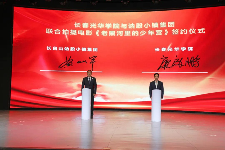 訥殷小鎮(zhèn)集團總裁黃燦宇與長春光華學(xué)院董事長康啟鵬現(xiàn)場簽約聯(lián)合拍攝電影《老黑河里的少年營》。長白山池南區(qū)委員會供圖