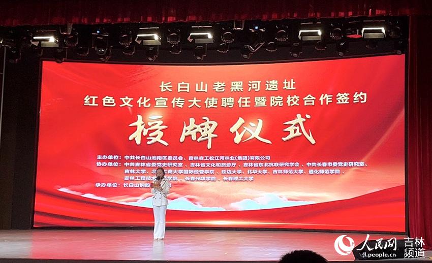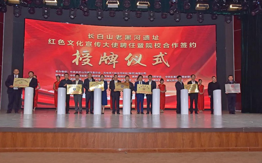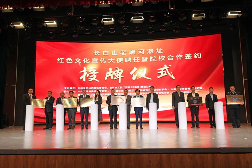 人民網(wǎng)長白山9月19日電 (李思玥)17日下午,長白山老黑河遺址紅色文化宣傳大使聘任暨院校合作簽約授牌儀式在長白山池南區(qū)訥殷演藝中心舉行。