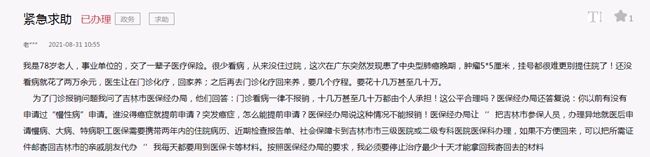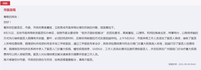 收到留言后,吉林市委、市政府立即責(zé)成市醫(yī)保局處理問(wèn)題。吉林市醫(yī)保局9月8日回復(fù)稱(chēng):“從便民、利民的角度出發(fā),特事特辦,將以微信傳輸?shù)姆绞较刃薪邮樟粞匀瞬∏橛嘘P(guān)依據(jù)、要件,必須的紙質(zhì)材料后期采用郵寄的方式在醫(yī)院端存檔。上午9時(shí)26分,市醫(yī)保局工作人員添加了留言人微信,接收了留言人所有檢查結(jié)果、病理資料并將資料傳至本地三甲級(jí)醫(yī)院,通過(guò)三甲醫(yī)院專(zhuān)家會(huì)診,其各項(xiàng)檢查結(jié)果均符合辦理門(mén)診重大疾病準(zhǔn)入標(biāo)準(zhǔn),院端打印了留言人檢查結(jié)果、病理報(bào)告存檔并在系統(tǒng)中錄入了留言人門(mén)診重大疾病、慢性疾病信息。上午10時(shí)6分,工作人員將此情況迅速反饋給留言人,并告知其在廣州醫(yī)院門(mén)診治療重大疾病費(fèi)用可以納入報(bào)銷(xiāo)范圍。留言人對(duì)處理結(jié)果及解決速度表示滿(mǎn)意并致謝工作人員!