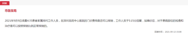 9月13日,吉林市醫(yī)保局再次對(duì)網(wǎng)友的問(wèn)題進(jìn)行回復(fù):“2021年9月9日凌晨4時(shí)35份,患者家屬詢(xún)問(wèn)工作人員,在深圳龍崗中心醫(yī)院的門(mén)診費(fèi)用是否可以報(bào)銷(xiāo),工作人員于當(dāng)日5時(shí)15分回復(fù),如確診后,對(duì)于患病部位的檢查和治療是可以按照?qǐng)?bào)銷(xiāo)比例正常報(bào)銷(xiāo)的!