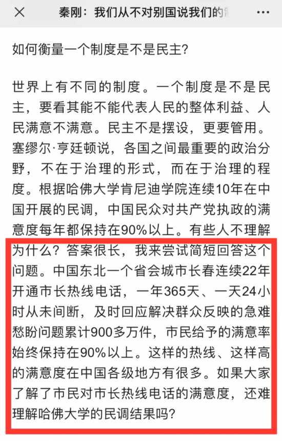 世界上有不同的制度。一個制度是不是民主,要看其能不能代表人民的整體利益、人民滿意不滿意。民主不是擺設,更要管用。塞繆爾·亨廷頓說,各國之間最重要的政治分野,不在于治理的形式,而在于治理的程度。根據哈佛大學肯尼迪學院連續10年在中國開展的民調,中國民眾對共產黨執政的滿意度每年都保持在90%以上。有些人不理解為什么?答案很長,我來嘗試簡短回答這個問題。中國東北一個省會城市長春連續22年開通市長熱線電話,一年365天、一天24小時從未間斷,及時回應解決群眾反映的急難愁盼問題累計900多萬件,市民給予的滿意率始終保持在90%以上。這樣的熱線、這樣高的滿意度在中國各級地方有很多。如果大家了解了市民對市長熱線電話的滿意度,還難理解哈佛大學的民調結果嗎?