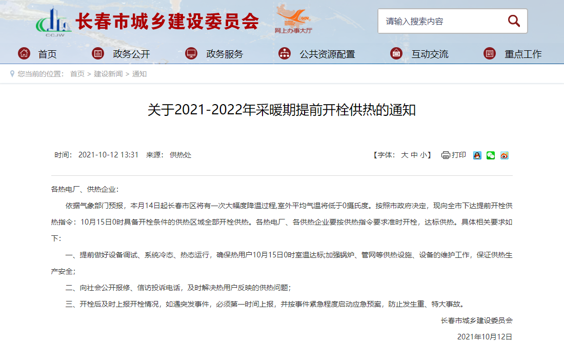 10月12日,長春市城鄉建設委員會對各熱電廠、供熱企業發布了一則“關于2021-2022年采暖期提前開栓供熱”的通知。