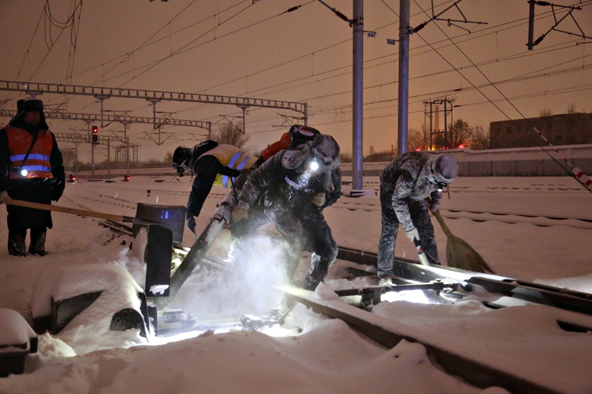 “前方積雪覆蓋嚴重,申請除雪天窗!”7日晚,在京哈高鐵遼寧朝陽站進站前100米處在線路上,出現積雪掩埋線路的緊急情況,30余名鐵路職工第一時間奔赴現場,僅用30分鐘時間就及時清除了積雪,保障了運輸暢通。