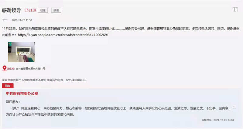 一條留言,溫暖一冬。11月28日,該網友在人民網“領導留言板”留言致謝:“此前我們反映關于供暖不達標問題已解決,現室內溫度已達標,感謝領導、感謝住建局物業辦熱線的同志們多次打電話詢問和回訪。感謝!感謝!”