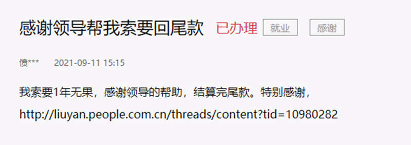 “我索要一年無果,現在尾款已結算完,感謝領導的幫助,特別感謝。”該網友對政府幫其討回勞務報酬表示感謝。