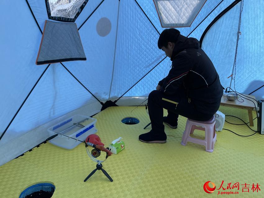 在湖面帳篷內(nèi)感受溫暖愜意的戶外冰釣。人民網(wǎng) 李思玥攝