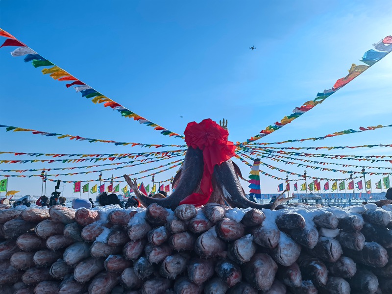 在查干湖年貨、非遺產品展銷大集上,年貨產品琳瑯滿目,非遺“鐵魚”為冬捕“添彩”。“大家看到的魚、辣椒、餃子等都是鐵藝作品,寓意年年有魚、紅紅火火,也希望能為查干湖冬捕‘添彩’。”吉林省鐵制品制作技藝非遺傳承人隋進才說。