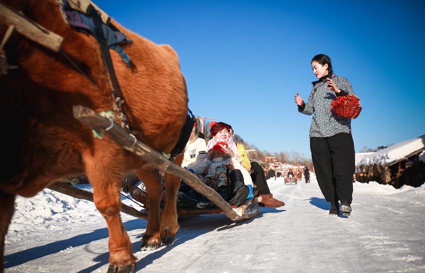村里為游客提供的牛拉爬犁。