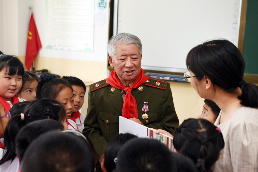 軍休干部溫守剛在小學生中開展國防教育。
