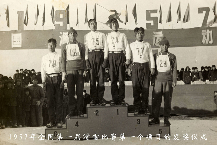 1957年全國第一屆滑雪比賽第一個項目的頒獎儀式,圖中右三為單兆鑒。(受訪者供圖)