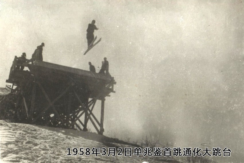 1958年3月2日,當年的年度賽事已經結束,在通化市江南滑雪場,運動員們做些技術性的訓練。“當時大家心情很放松,情緒高昂,滑雪場跳臺建成后還從未有人練過,看著跳臺,我就下決心要征服它。”單兆鑒說,就是在那里,他創造了“中國跳臺滑雪第一跳”的歷史,開創了中國跳臺滑雪的先河。