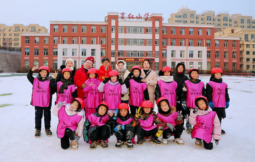 單兆鑒和通化市育紅小學的“腳滑子”小隊。(受訪者供圖)