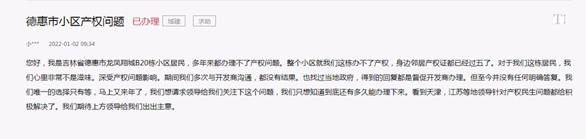 “您好,我是吉林省德惠市龍鳳翔城B20棟小區居民,多年來都辦理不了產權問題,整個小區就我們這棟辦不了產權。”眼看身邊鄰居的產權證都已經到手五年了,大家伙兒的心里非常不是滋味。