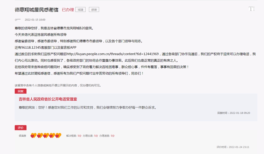 “今天來信代表這棟居民感謝所有領導,感謝省委領導,感謝市委領導,特別感謝我們德惠市市委領導,以及各個部門領導與同志,還有96118、12345客服部門以及留言板APP。”該網友在感謝信中對吉林省的各級政府及人民網“領導留言板”一一致謝。