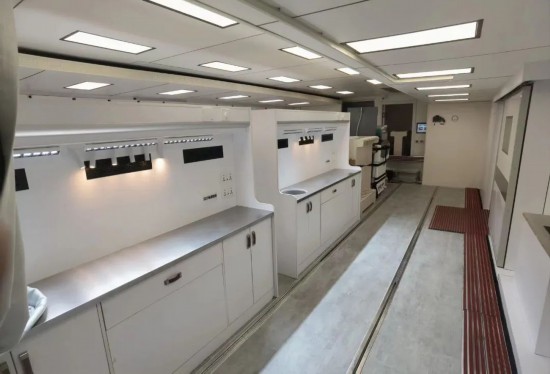 這款雪蠟車車頭采用一汽解放最新的J7作為牽引。車廂完全由鋁合金制作,主體結構采用高鐵車廂成型技術,整體剛性好、耐腐蝕,整備質量較鋼質產品減輕4噸以上。車廂全長13.7米,廂體兩側可拓展,展開后使用面積達62.1平方米,分為工作區、休息區、生活輔助區和設備區,可存放各類規格滑雪板114副。打蠟區可同時供4人打蠟操作。車內設有送風、排風系統,以及環境顯示屏、比賽現場直播顯示屏;車外設有監控系統。(來源:遼源吉D微風 呂琳 胡希偉)(有刪改)