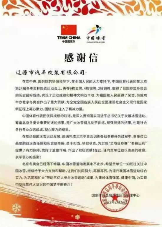 2月21日,遼源市汽車改裝有限公司收到了來自國家體育總局冬季運動管理中心的感謝信。