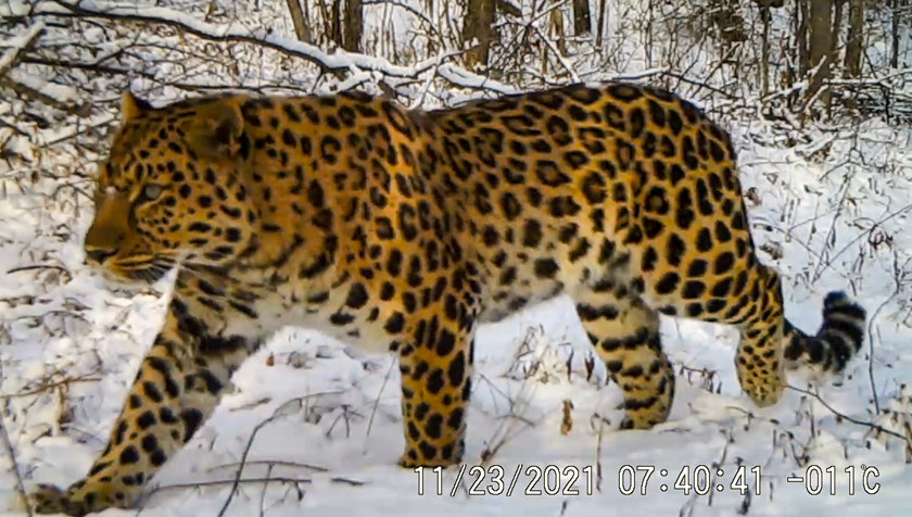 2021年11月23日,白雪皚皚,玉樹瓊枝。一只野生東北豹走過紅外相機的鏡頭前,眼眸閃亮,豹尾輕甩,身上的花紋清晰美麗。