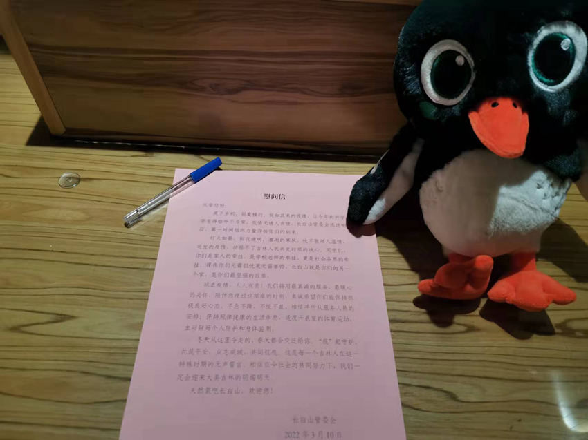 長白山管委會為隔離人員準備的《慰問信》。(受訪者供圖)