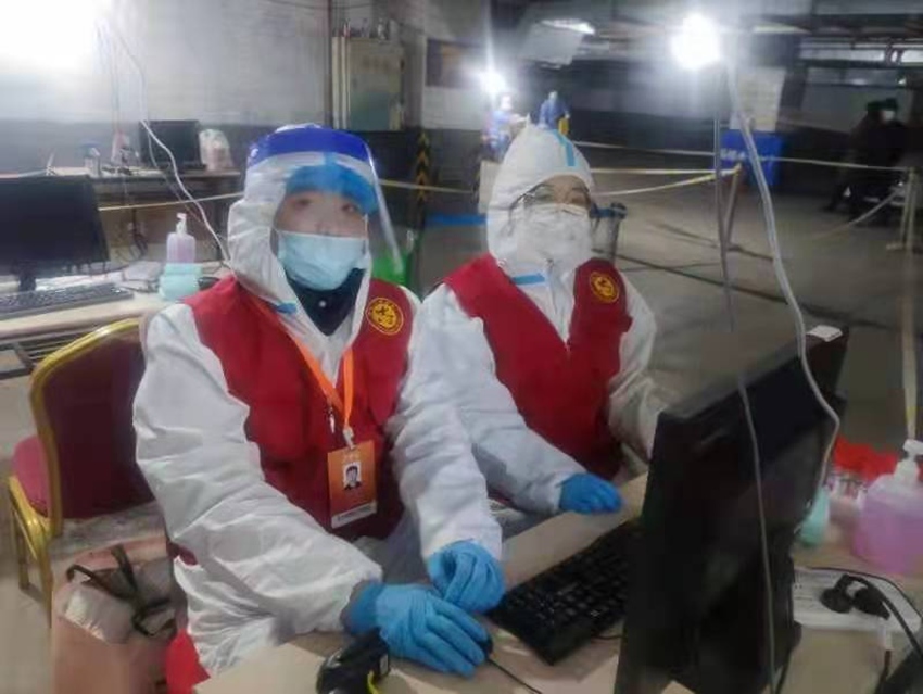 七彩城支行志愿者在核酸檢測點幫助錄入居民信息。九臺農商銀行供圖