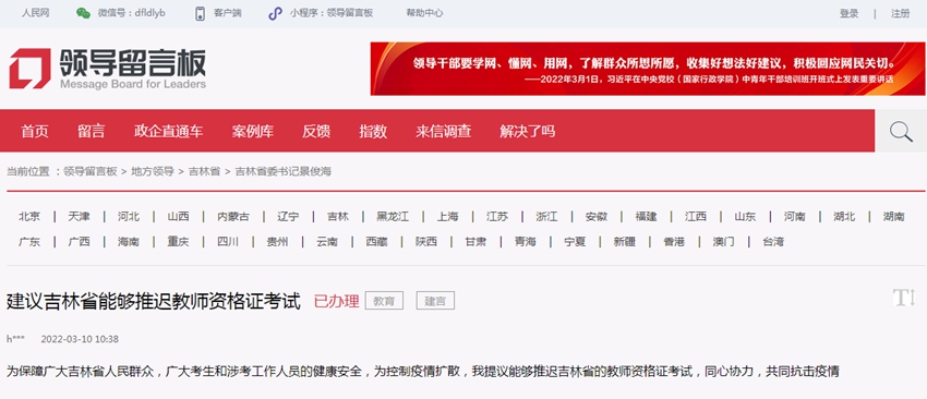 近日,由于新冠肺炎疫情形勢嚴峻,吉林省多個城市被按下了“暫停鍵”。3月10日,一位網(wǎng)友在人民網(wǎng)“領(lǐng)導(dǎo)留言板”留言,建議推遲吉林省的教師資格證考試。