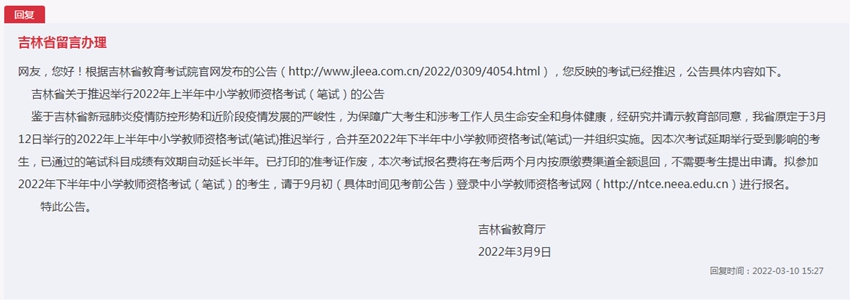 3月9日,吉林省教育廳發(fā)布了《吉林省關(guān)于推遲舉行2022年上半年中小學(xué)教師資格考試(筆試)的公告》,鑒于吉林省新冠肺炎疫情防控形勢和近階段疫情發(fā)展的嚴峻性,為保障廣大考生和涉考工作人員生命安全和身體健康,經(jīng)研究并請示教育部同意,吉林省原定于3月12日舉行的2022年上半年中小學(xué)教師資格考試(筆試)推遲舉行,合并至2022年下半年中小學(xué)教師資格考試(筆試)一并組織實施。因本次考試延期舉行受到影響的考生,已通過的筆試科目成績有效期自動延長半年。已打印的準考證作廢,本次考試報名費將在考后兩個月內(nèi)按原繳費渠道全額退回,不需要考生提出申請。擬參加2022年下半年中小學(xué)教師資格考試(筆試)的考生,請于9月初(具體時間見考前公告)登錄中小學(xué)教師資格考試網(wǎng)(http://ntce.neea.edu.cn)進行報名。