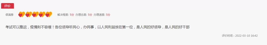 對此,該網(wǎng)友為該留言回復(fù)送上了滿分好評,并表示,考試可以推遲,疫情刻不容緩!各位領(lǐng)導(dǎo)聽民心,辦民事,以人民利益放在第一位,是人民的好領(lǐng)導(dǎo),是人民的好干部。