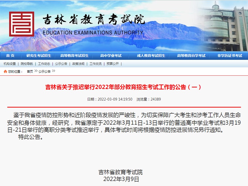 《吉林省關(guān)于推遲舉行2022年部分教育招生考試工作的公告(一)》