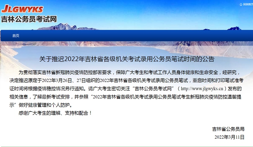 《關(guān)于推遲2022年吉林省各級機關(guān)考試錄用公務(wù)員筆試時間的公告》