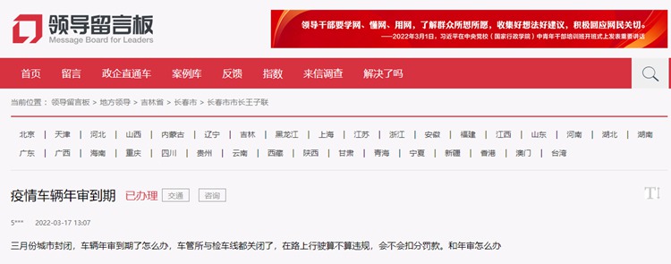 人民網長春3月23日電 (關思聰)“三月份城市封閉,車輛年審到期了怎么辦,車管所與檢車線都關閉了,算不算違規?會不會扣分罰款?年審怎么辦?”近日,長春網友通過人民網“領導留言板”留言時寫道。