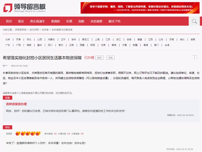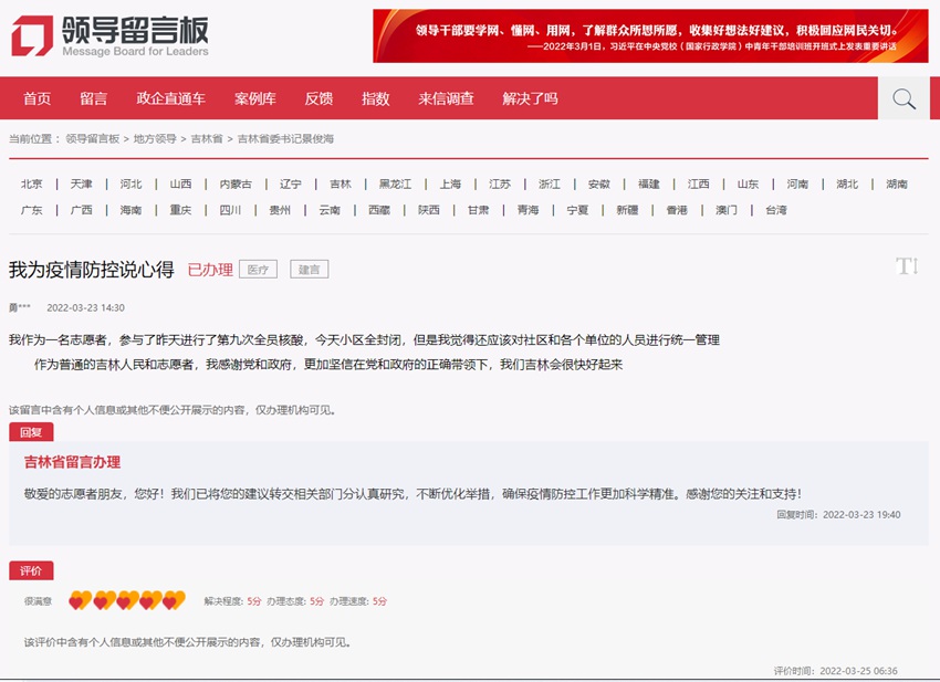 連日來,在吉林省疫情防控的關鍵時刻,多位吉林網友通過“領導留言板”一起出謀劃策,共同攜手筑牢疫情防控安全防線。