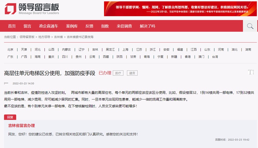 收到留言后,吉林省委辦公廳網絡輿情處第一時間給與回復:“您的建議已收悉,已轉交相關地區和部門認真研究。感謝您對疫情防控工作的關注和支持!”
