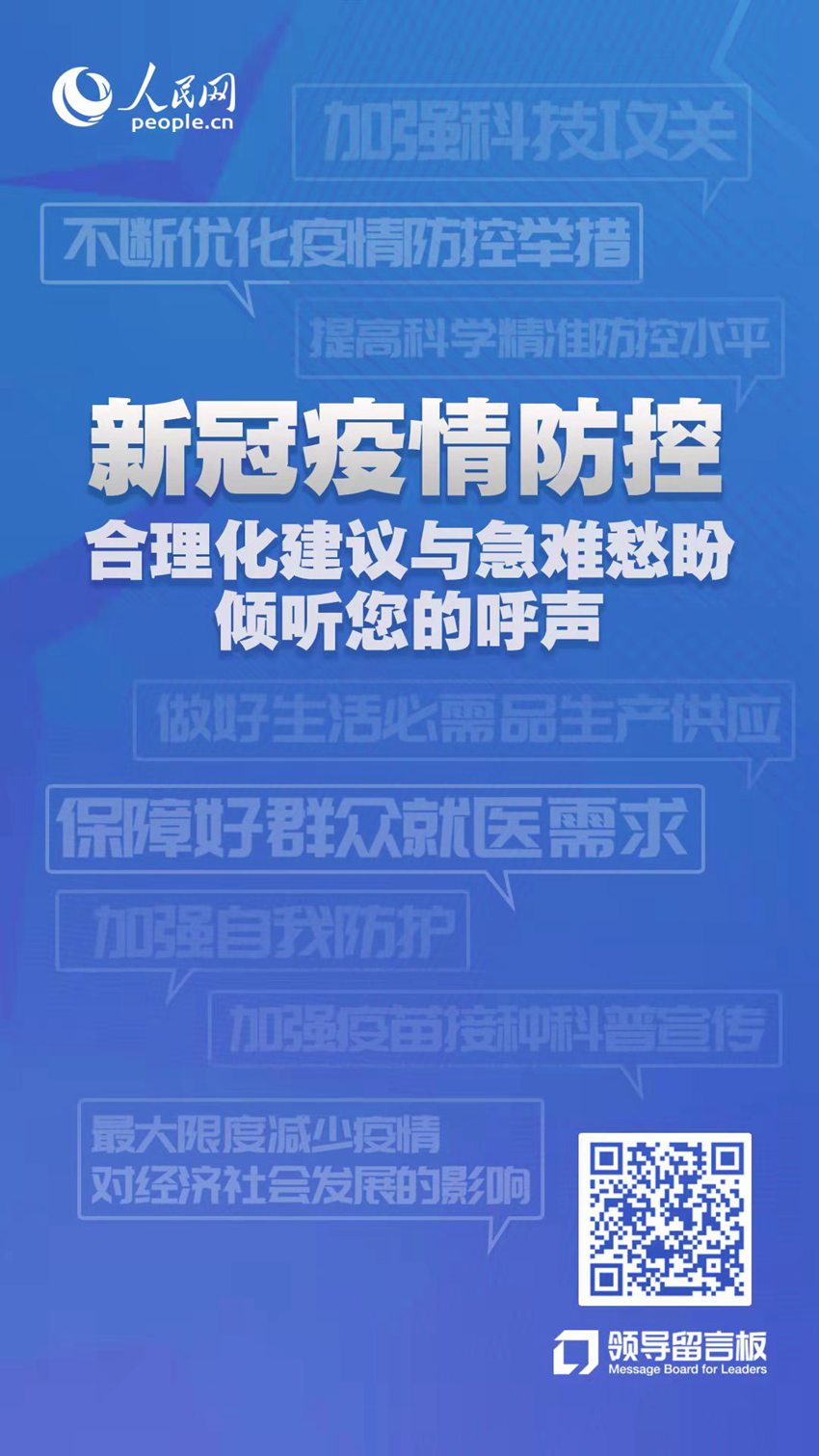 加強疫情防控,傾聽您的呼聲。關于疫情防控,您還有哪些針對性需求或建議,歡迎到人民網“領導留言板”留言。