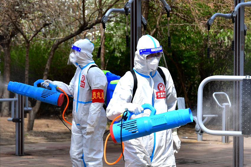 小區臨時黨支部黨員進行消殺。(長春市委組織部供圖)