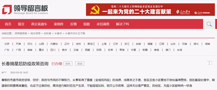 人民網長春5月13日電 (關思聰)5月1日15時起,長春市全域均為低風險區,至此,長春市通信大數據行程卡成功“摘星”。近日有網友通過人民網“領導留言板”留言,對長春“摘星”后防疫政策提出了自己的一點建議。