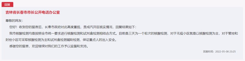 收到留言后,長春市政府對此高度重視,責成長春汽開區核實情況,予以回復。