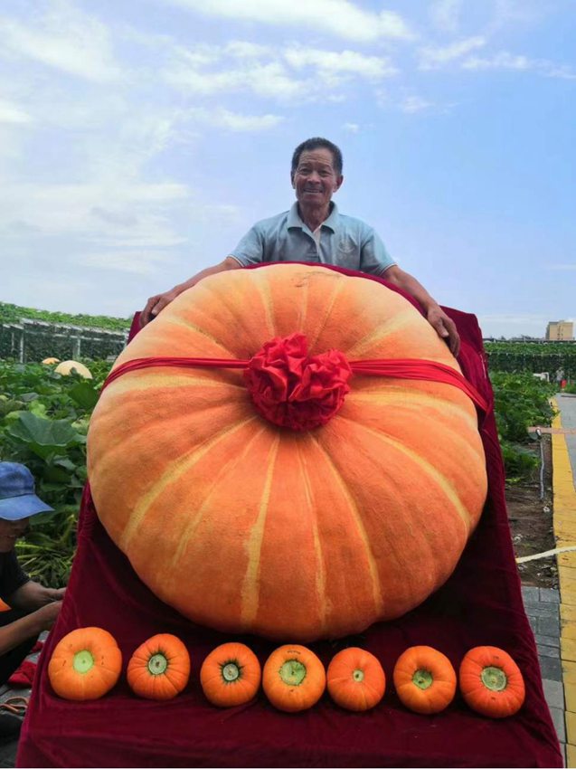 藍天麗日下,青綠的藤蔓間,臥著碩大橙紅的南瓜。有多大?千余斤!