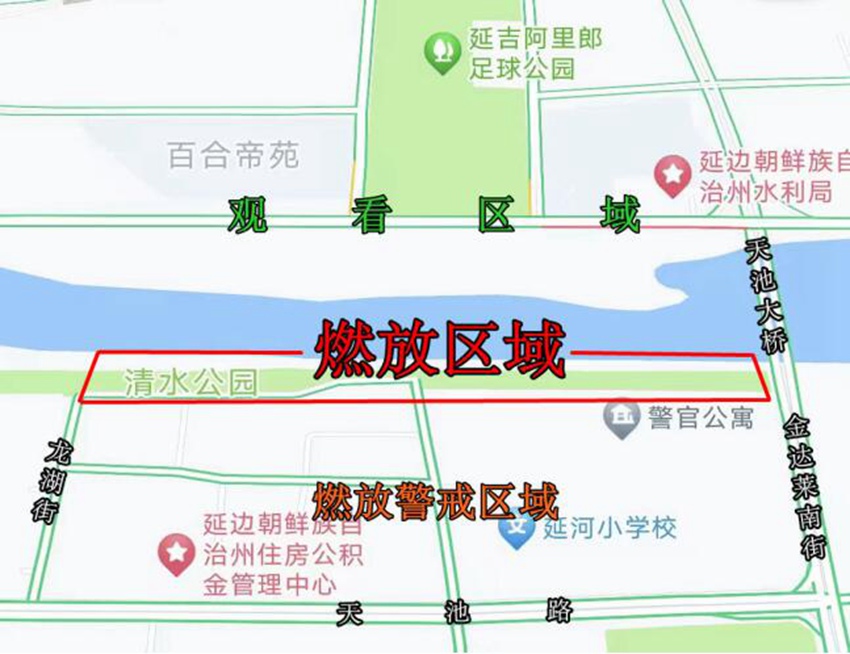 此次焰火晚會設置了燃放區域,區域內禁止一切人員和車輛出入。同時設置了燃放警戒區,具體區劃定范圍域為:東起金達萊南街向西至龍湖街,南起天池路向北至濱河公園(清水公園)。