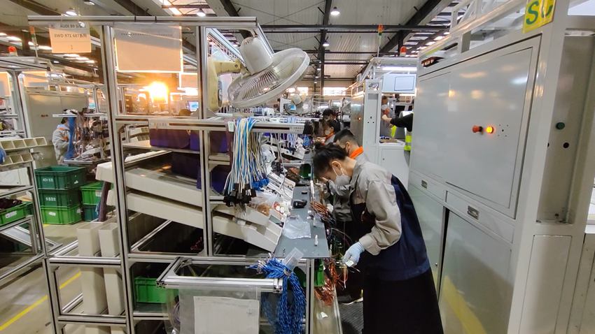 走進捷翼汽車零部件有限公司(以下簡稱捷翼汽車)生產車間,“人機共舞”的場景在此上演,生產線在高速運轉,AGV小車按軌跡運送物料;智能機器人將下線、壓接等工藝標準化實現;工人們在流水線前整齊排列,麻利地將一根根導線、護套按照線束圖組裝在一起。幾十根甚至幾百根導線經過工人們的細心操作,捋順成一束……