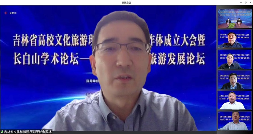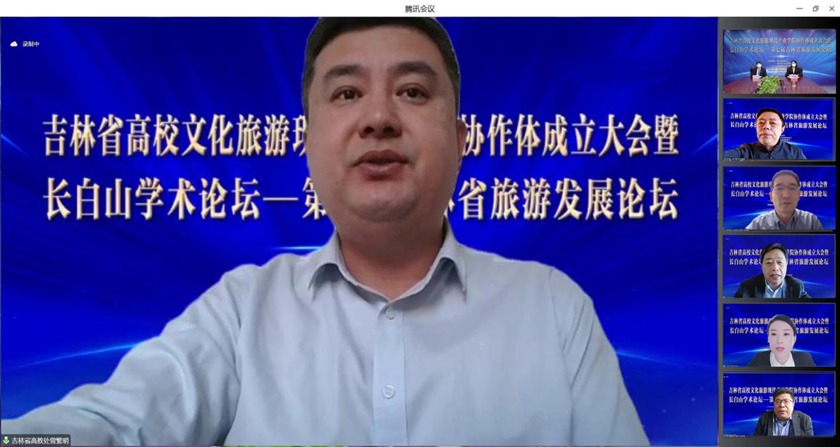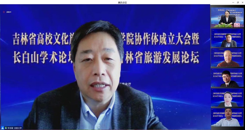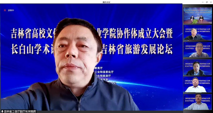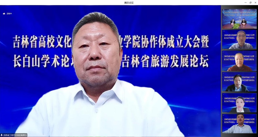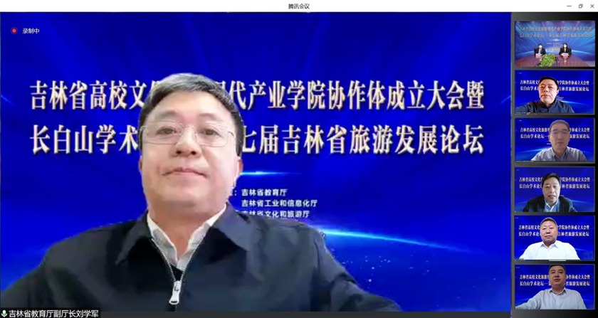 文旅融合迎盛會,共謀發(fā)展話未來。12月16日,吉林省高校文化旅游現(xiàn)代產(chǎn)業(yè)學(xué)院協(xié)作體成立大會暨長白山學(xué)術(shù)論壇——第七屆吉林省旅游發(fā)展論壇在長春大學(xué)旅游學(xué)院舉行。會議采取線上形式召開。省教育廳副廳長、廳黨組成員、省委教育工委副書記劉學(xué)軍,省工業(yè)和信息化廳黨組成員、副廳長宋曉輝,省文化和旅游廳黨組成員、副廳長金振林,省教育廳高等教育處處長曾繁明、教育科技產(chǎn)業(yè)服務(wù)中心主任曹文,省工信廳企業(yè)處處長楊真玉,省教育廳高等教育處一級調(diào)研員楊立興,長春大學(xué)旅游學(xué)院副董事長鄭曉明、校長劉耀輝、黨委書記范琳琳出席。開幕式由范琳琳主持。