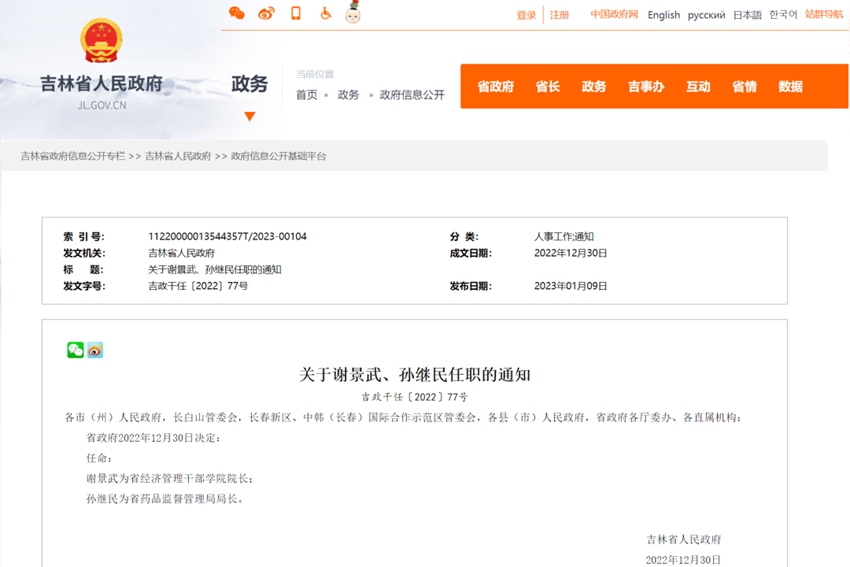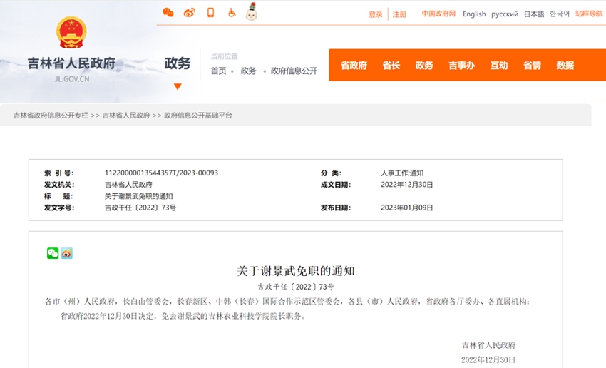 省政府2022年12月30日決定,免去謝景武的吉林農業科技學院院長職務。