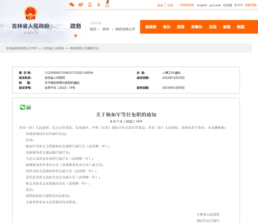 楊如軍為省人力資源和社會保障廳副廳長(試用期一年);