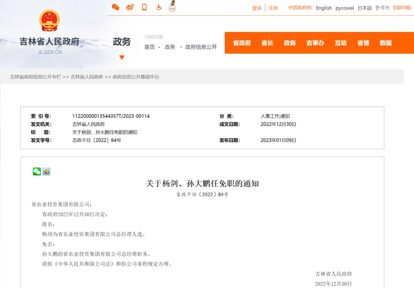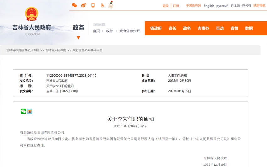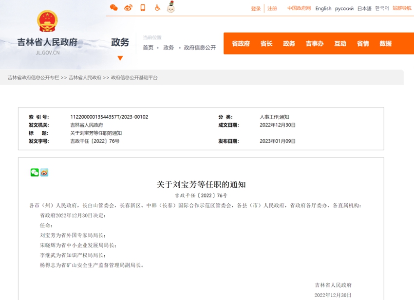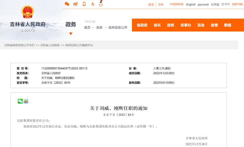 省政府2022年12月30日決定,任命劉威、剛輝為長影集團有限責任公司副總經理(試用期一年)。
